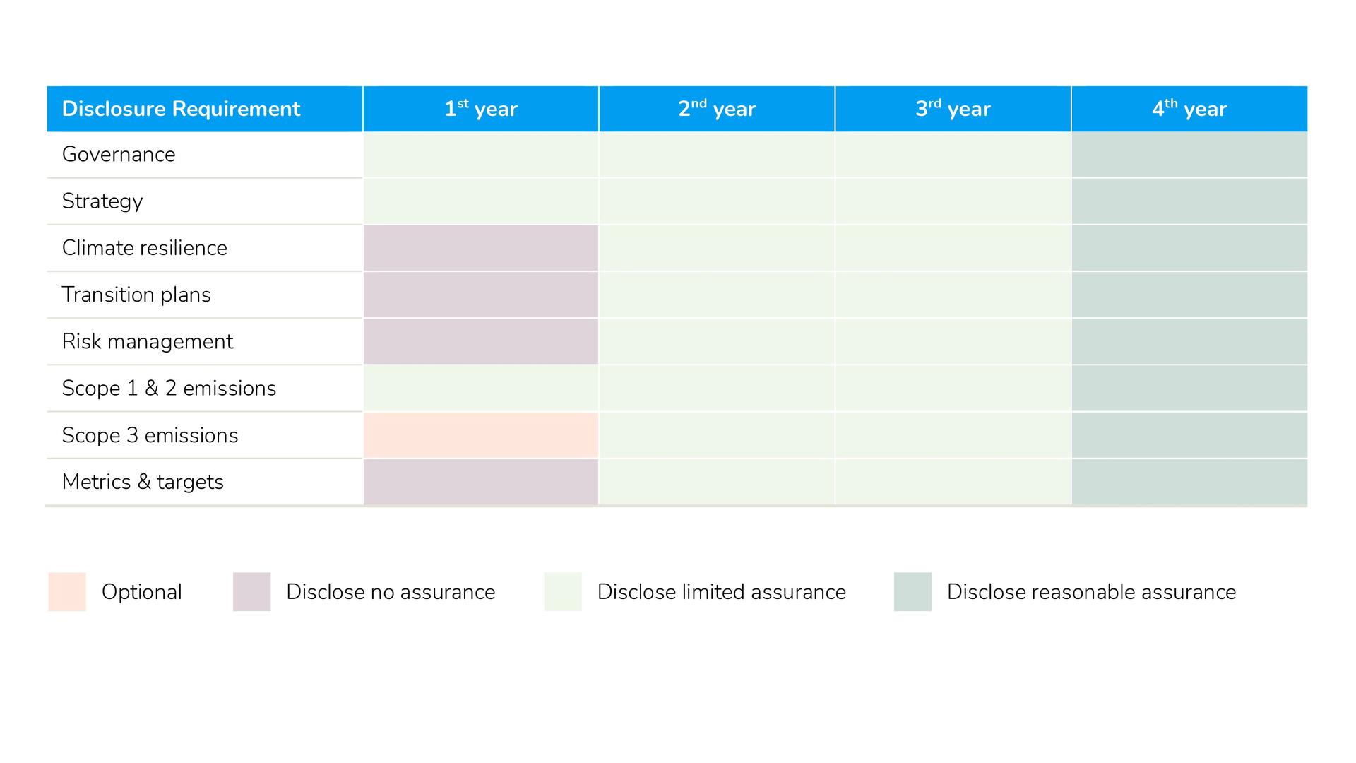The ASRS are being introduced for large companies over the next three years using a phasing system. The date that companies must comply depends on financial criteria and NGER obligations. However, the extent of information covered in disclosures is also being phased in by requiring more detail as time goes on. As shown in Table 2, in year 1, some topics can be disclosed with no assurance, some disclosed with limited assurance, and Scope 3 (supply chain) emissions are optional. In years 2 and 3, all topics are included with limited assurance, and by year 4, all disclosures must have reasonable assurance.