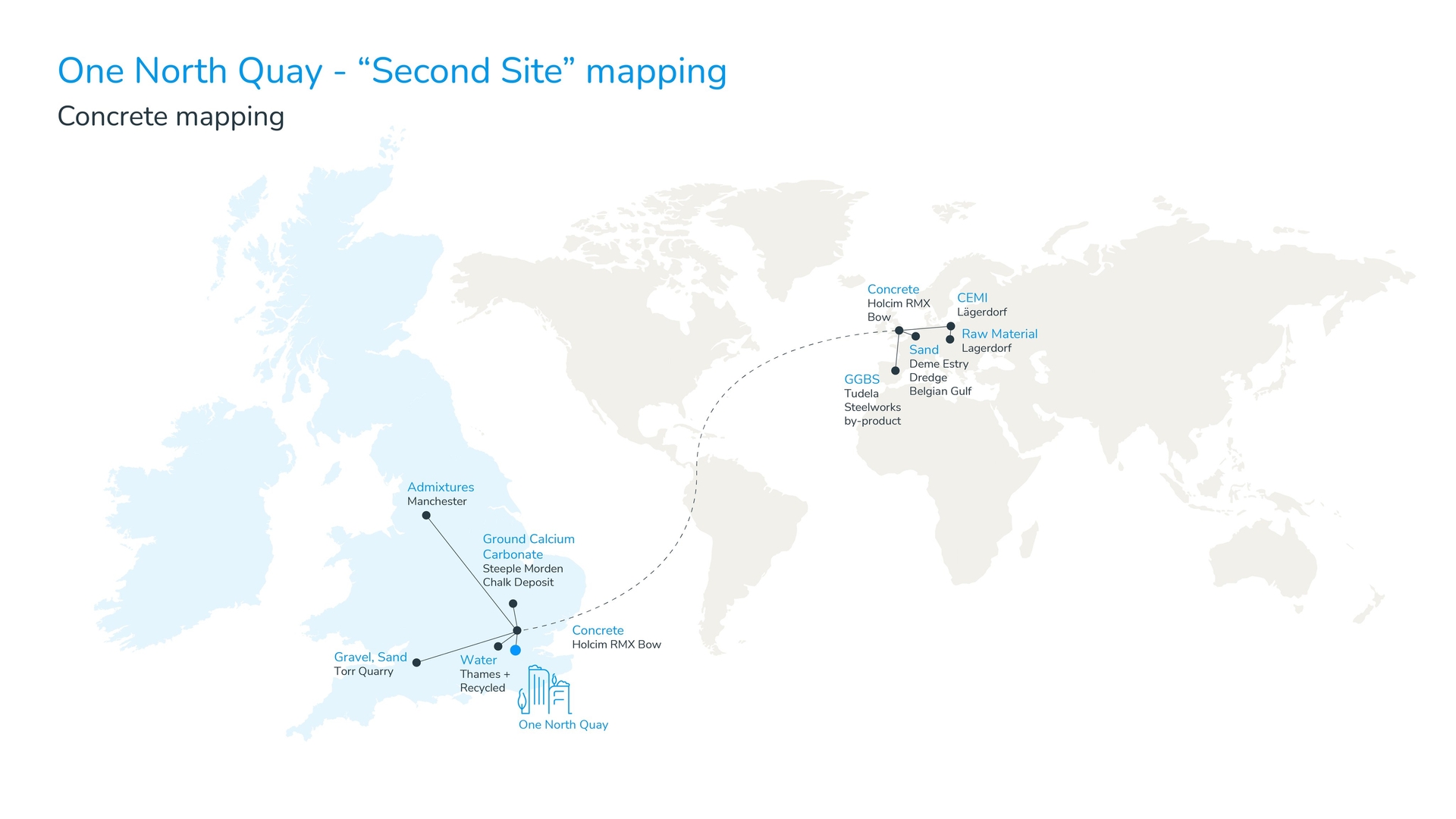 The biodiversity impacts of construction often occur far from the project site, at the locations where materials are extracted - referred to as a 'second site'. For this project, we have been working to map the scope of our 'second site' associated with structural materials. This was achieved through live tracking of all structural construction materials entering the site boundary, combined with close collaboration with suppliers to identify downstream sources of raw materials.